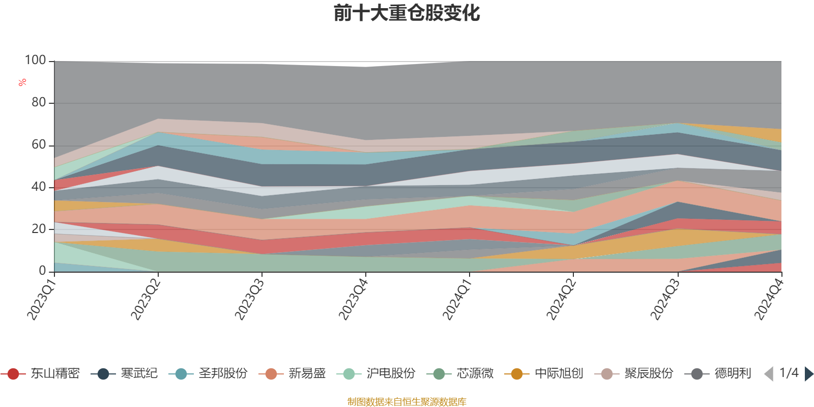 基金管理人在四季报中表示,整个四季度,我们维持了对半导体设备/材料等板块的配置。我们判断AI大模型在云端预训练的技术进展趋于瓶颈,因此对相关链条的标的明显减仓,但加仓了消费电子和少量端侧AI品种。在国产替代加速的大背景下,我们一直以来看好的部分半导体设备/材料公司或将受益,我们预计未来两年可能会有突破性进展。