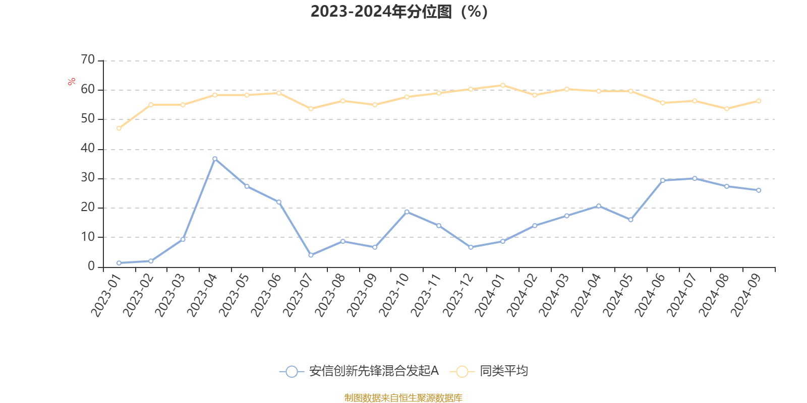 通过所选区间该基金净值增长率分位图,可以观察该基金与同类基金业绩比较情况。图为坐标原点到区间内某时点的净值增长率在同类基金中的分位数。